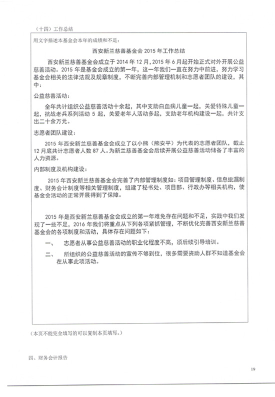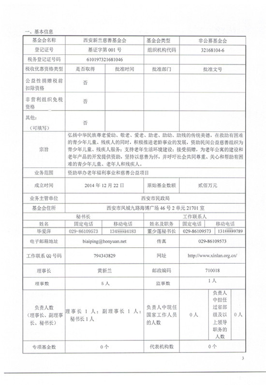 西安新兰慈善基金会由黄新兰女士发起,经西安市民政局核准,于2014年12月22日正式登记成立。 新兰慈善基金会专业化、规范化、职业化,追求高效、透明,以及慈善效果可度量, 为非公募基金会。基金会的宗旨是:“做民间公益和社会创新的资源提供者”,致力于中国慈善业的规范和繁荣发展, 资助举办老年福利事业和开展形式多样的慈善公益项目。