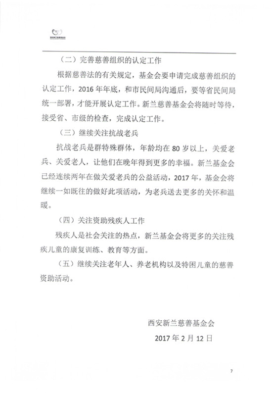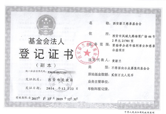 西安新兰慈善基金会由黄新兰女士发起,经西安市民政局核准,于2014年12月22日正式登记成立。 新兰慈善基金会专业化、规范化、职业化,追求高效、透明,以及慈善效果可度量, 为非公募基金会。基金会的宗旨是:“做民间公益和社会创新的资源提供者”,致力于中国慈善业的规范和繁荣发展, 资助举办老年福利事业和开展形式多样的慈善公益项目。
