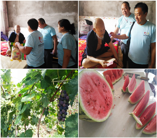 下午的时候,大家来到了另一位抗战老兵家,前来看望宫安芳老人,今年93岁高龄的宫老,于1937年加入38军,参加过中条山战役。比起张老,宫老略显迟暮,面对志愿者的到来和热情慰问,总是分不清楚前来探望他的究竟是谁。大家对此显得尤为热切关心,打心底里祝愿宫老身体健康,福寿康宁。一阵慰问后,志愿者代表李涛拿出来为老人送上慰问金、以及营养品,老人感动的连声道谢,连忙让儿子为前来的志愿者端上西瓜解暑。吃着甜甜的西瓜,大家心里暖暖的。