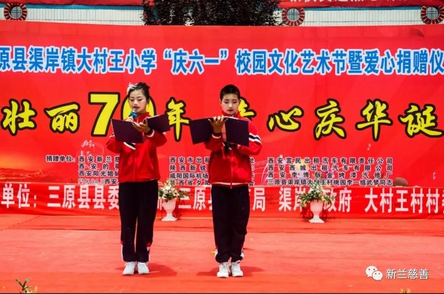 会上举行了爱心捐赠仪式,新兰慈善基金会出资人孙元昕代表基金会发言,他说”向陕西泰发祥实业集团的赵昕先生、西安的哥精英团的爱心人士以及其他爱心企业,表示深深的感谢(鞠躬),感谢他们为我们这次捐赠活动提供了资金支持。愿这批校服能带给学生们快乐!基金会能为振兴地方教育事业出一份力、献一份爱,对此我们深感无比安慰、无尚荣光。今年正逢中华人民共和国70年华诞,让我们一起朗读《少年中国说》中一小段:故今日之责任,不在他人,全在我少年。少年智,则国智。少年富,则国富。少年强,则国强。少年独立,则国独立。少年自由,则国自由。少年进步,则国进步。